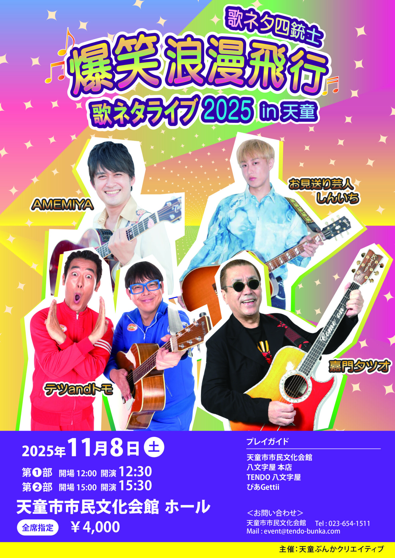 2025年11月8日(土)、天童市市民文化会館で「歌ネタ四銃士 爆笑浪漫飛行 歌ネタライブ2025 in天童」が開催されます🎤✨